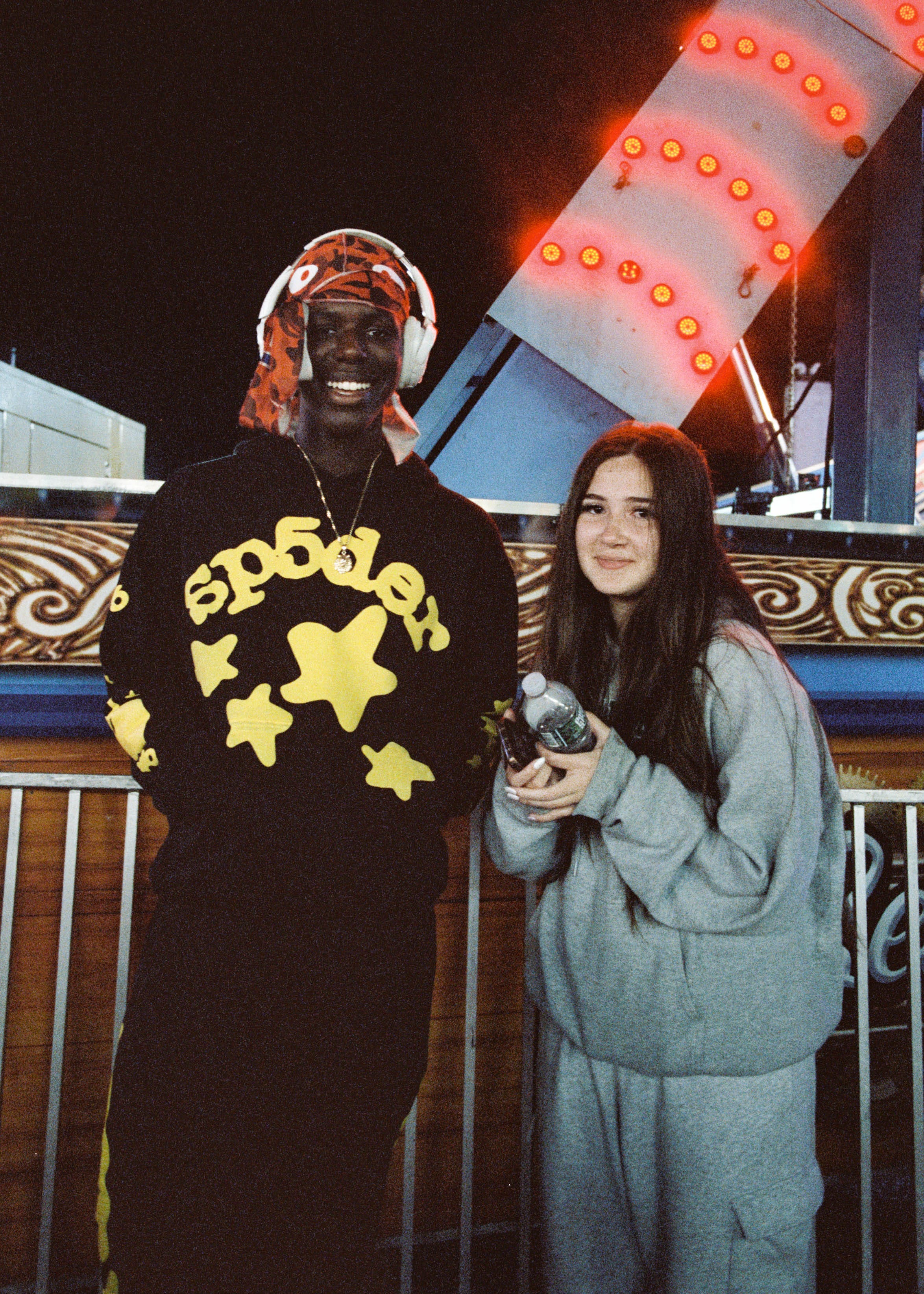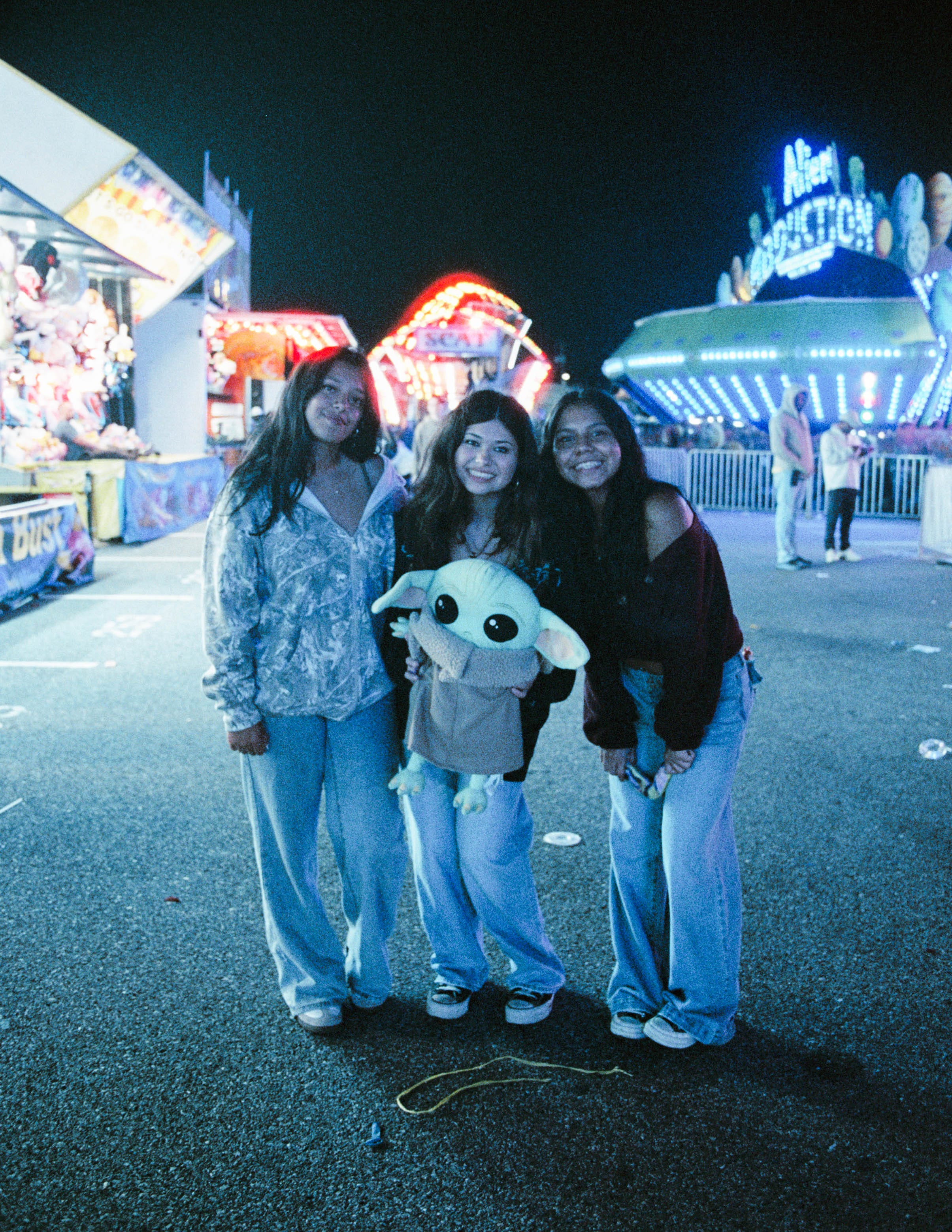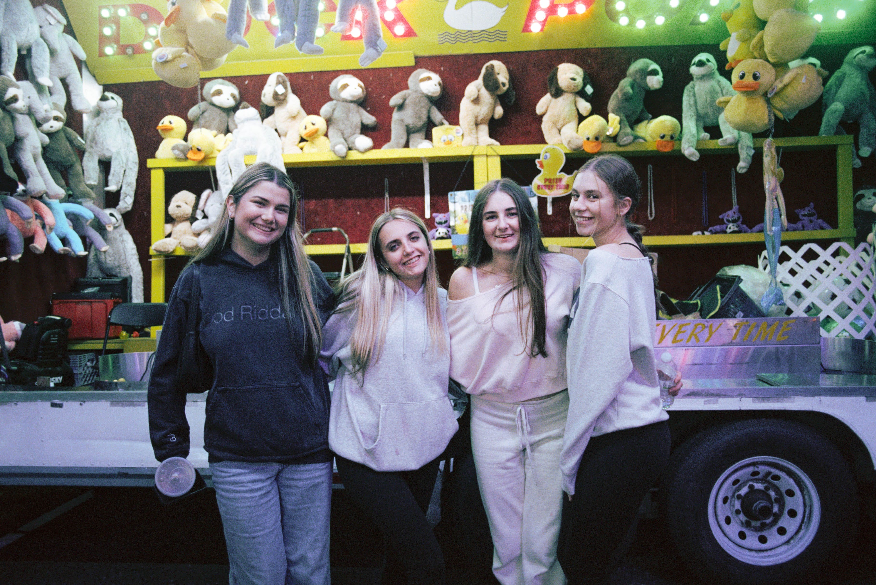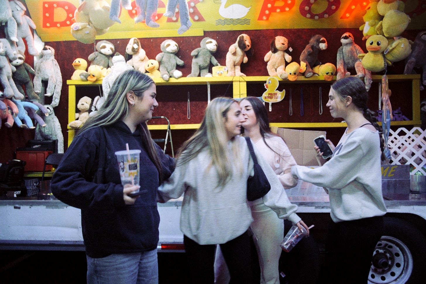 The air tonight is crisp, right for the fair, which is mostly attended by teenagers and kids a few years younger. The girls wear sweatpants (wide leg, low waist) with tank tops and sweaters that hang off one shoulder. The boys wear hoodies and gather in packs like nematodes in SpongeBob, broccoli haircuts bobbing. Everyone is in the going out version of their pajamas, which captures the energy here. It’s a big event, but you have to keep casual because you’re thirteen and that’s how it works.